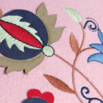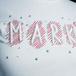 Como complemento ao bordado, há ainda a possibilidade da aplicação de materiais como pérolas, pedras, brilhantes, tachas ou tranferes, por exemplo.