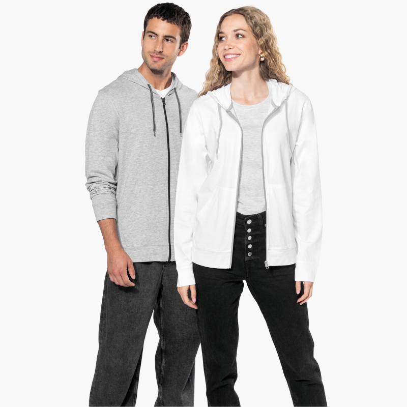 100% enzymbehandelte gekämmte Baumwolle (Oxford Grey: 90% Baumwolle/10% Viskose). Fühlt sich sehr weich an. Moderner und entspannter Schnitt. Kontrastierende Nahtabdeckungen (Dunkelgrau für Oxford-Grau und Oxford-Grau für andere Farben). 2 Kängurutaschen. Bündchen und Halsausschnitt im gleichen Stoff. Kontrastierender Reißverschluss und Kordelzug der Kapuze. STANDARD 100 by OEKO-TEX® Zertifikat Nr. CQ1007/7, IFTH.