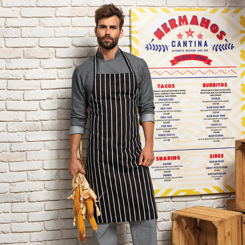 100% cotton. Apron with vertical stripes. Drawstrings in the same fabric.