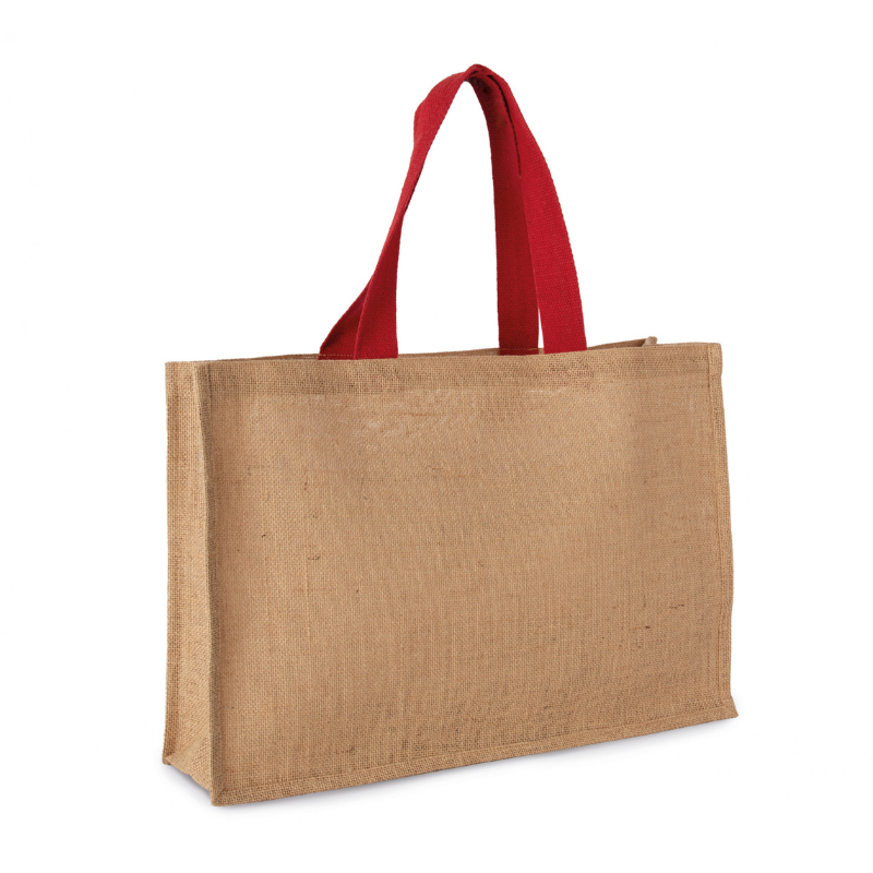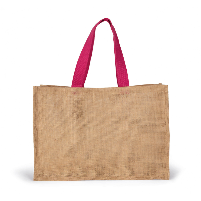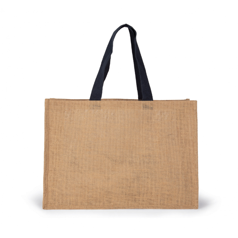 Sac en jute 100%. Taille XL avec anses de couleur contrastante. L'étirement à l'amidon végétal rigidifie le jute et conserve sa forme initiale.