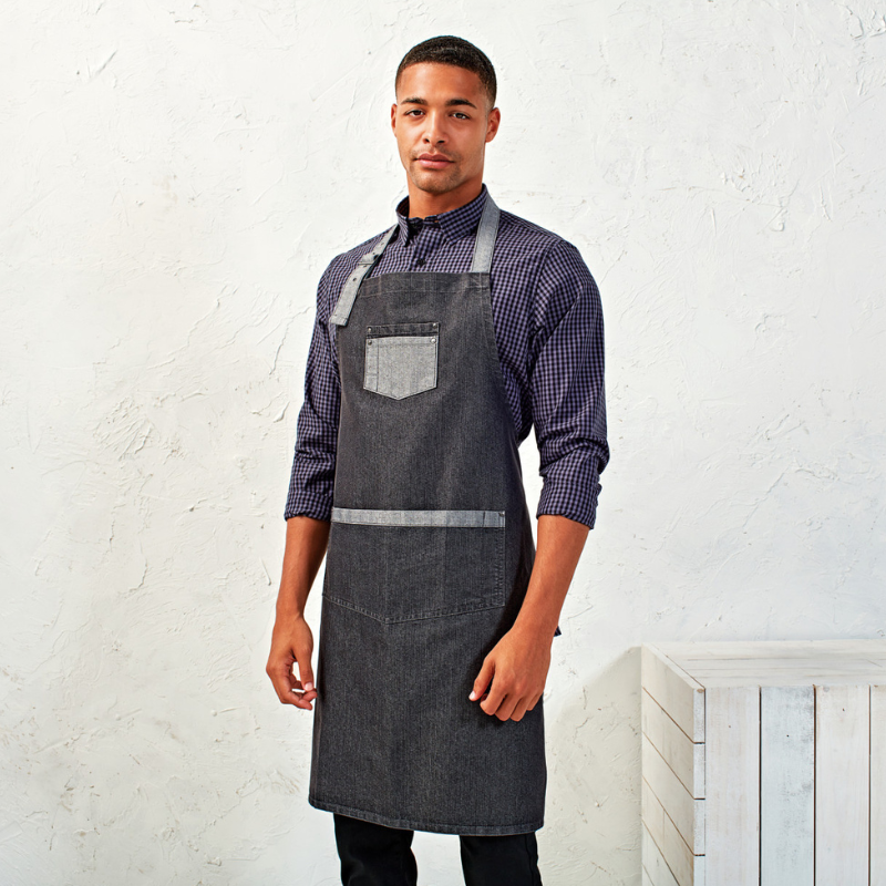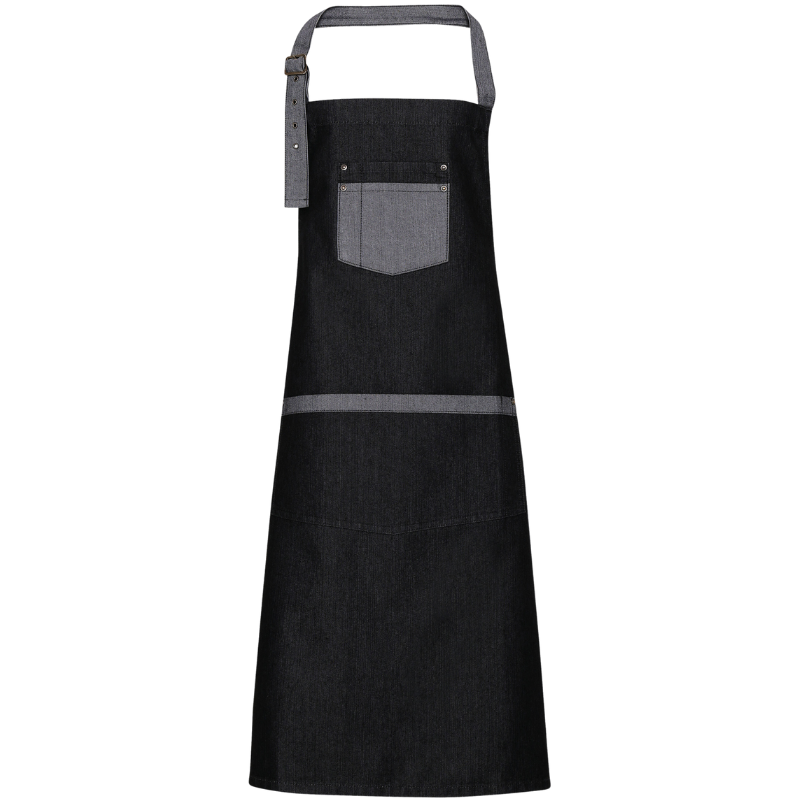 70% algodão / 30% poliéster. Este avental confere um certo charme “industrial” com ilhós grandes em metal ao nível do sistema de fecho. O avesso em contraste é visível nos bolsos e nas fitas, para um estilo reversível. Fivela de regulação no pescoço em metal para ajustar o comprimento do avental.