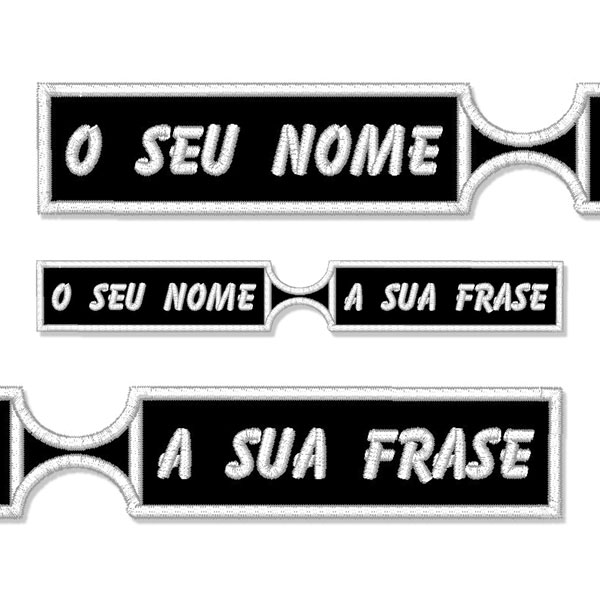Porta chaves com 3 cm de altura e 11 cm de comprimento, bordado a branco em fundo preto.
