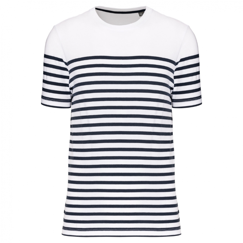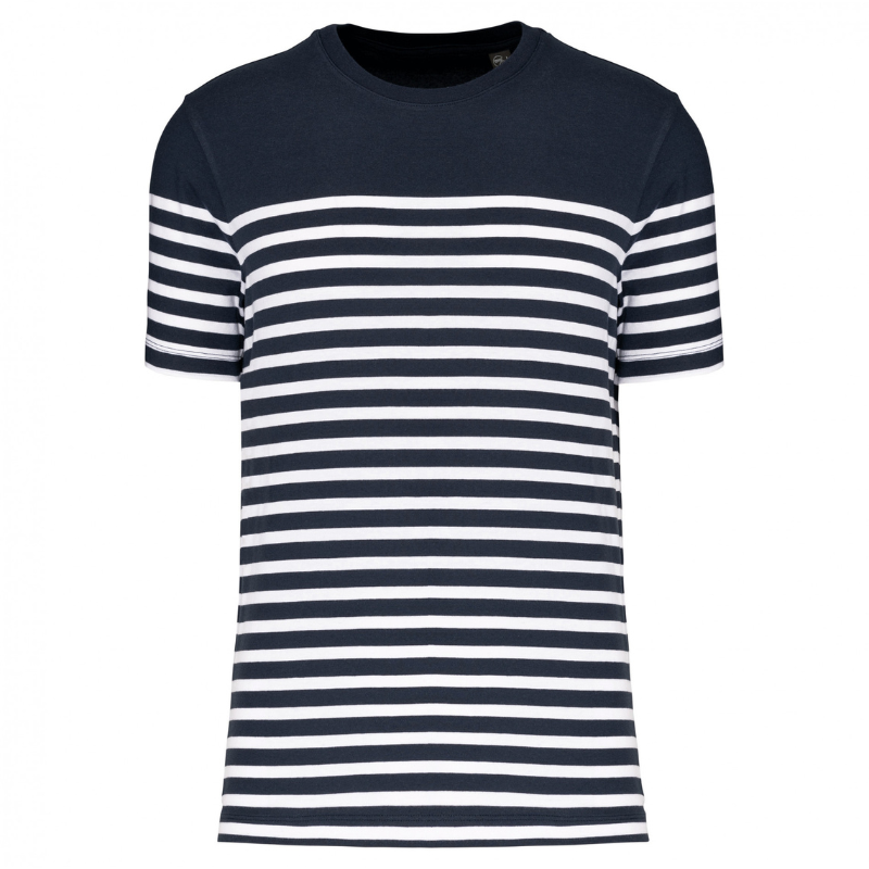 100% algodão biológico. Corte direito. Banho de enzimas. Decote redondo com acabamento em malha rib 1×1. Riscas tricotadas. Tapa-costuras no decote. Acabamento das mangas e bainha costura dupla. Certificado STANDARD 100 by OEKO-TEX® N° CQ 1007/7, IFTH.